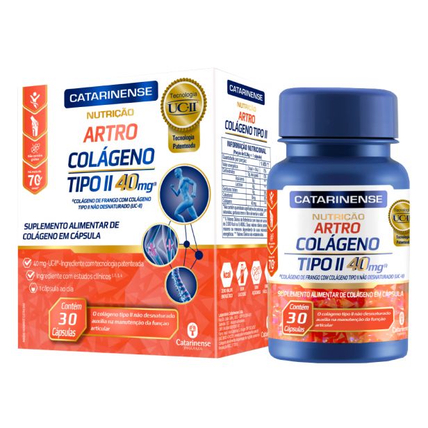 O Artro Colágeno Tipo II da linha Catarinense Nutrição possui colágeno tipo II não desnaturado em cápsulas e leva a tecnologia UC-II® (ingrediente patenteado com matéria-prima desenvolvida no Estados Unidos). A cartilagem articular é composta também de colágeno tipo II e esse tipo de colágeno não desnaturado auxilia na manutenção da função articular.
