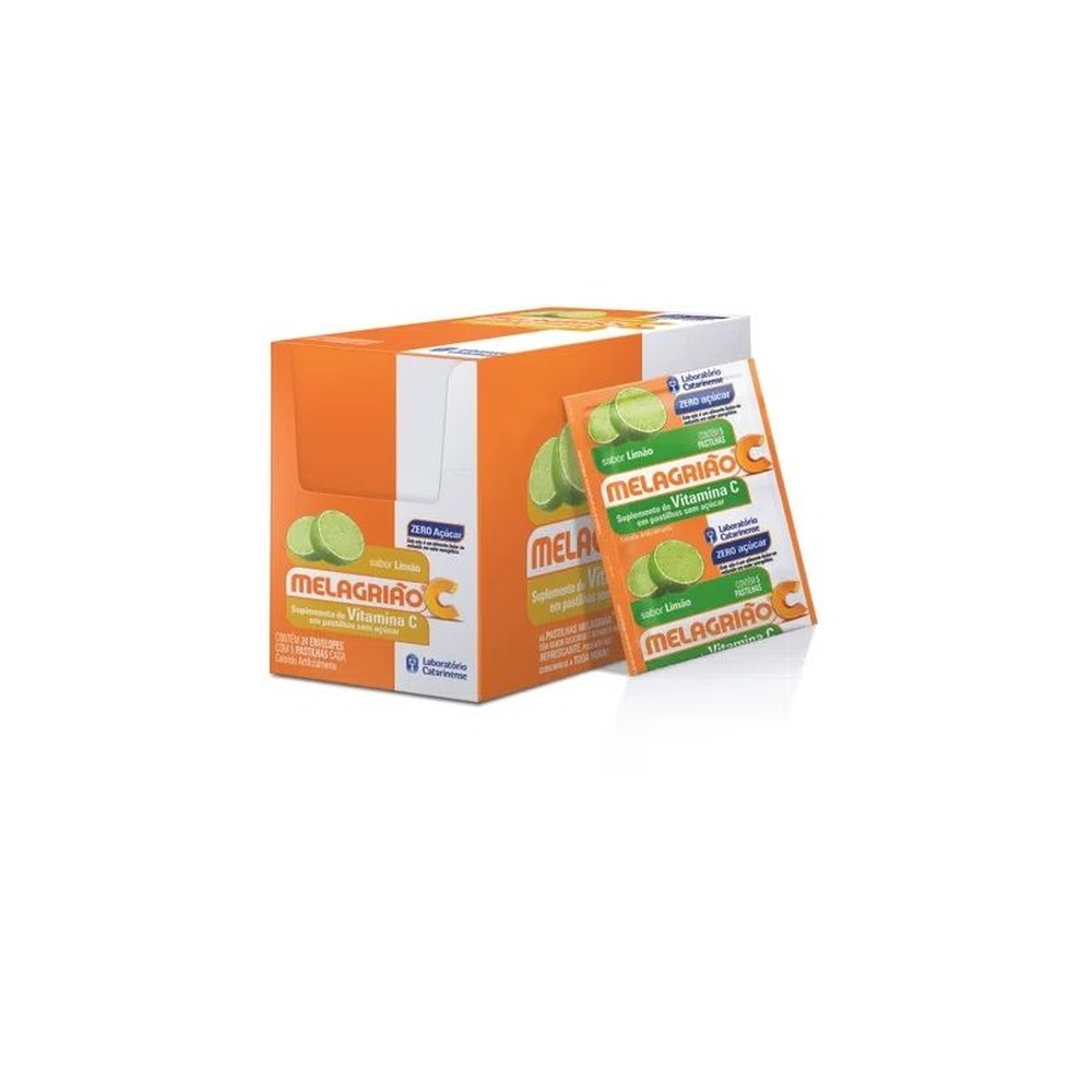 Melagrião Vitamina C Pastilhas. Categoria de alimento dispensado de registro, conforme RDC 27/2010. Gestantes, nutrizes e crianças até 3 (três) anos, somente devem consumir este produto sob orientação de nutricionistas ou médicos.
