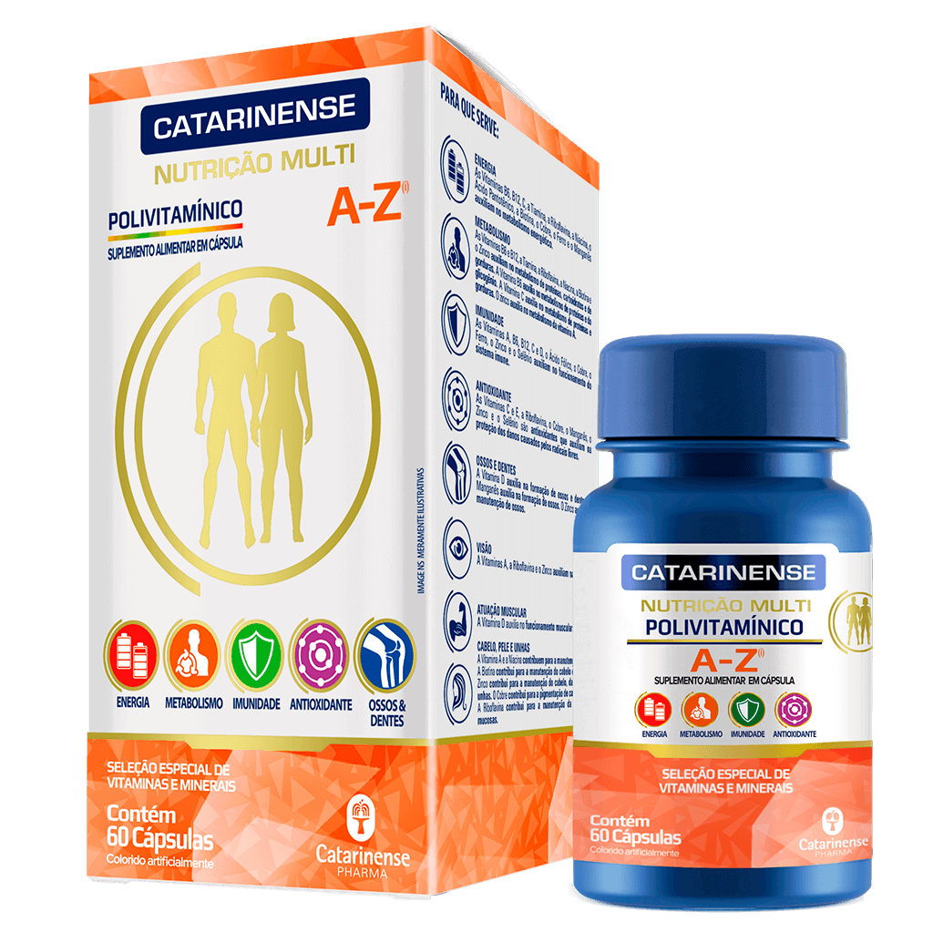 Multi A-Z possui em sua composição 12 vitaminas e 5 minerais cuidadosamente selecionados, isentos de açúcares, gorduras totais, valor energético, lactose e glúten.